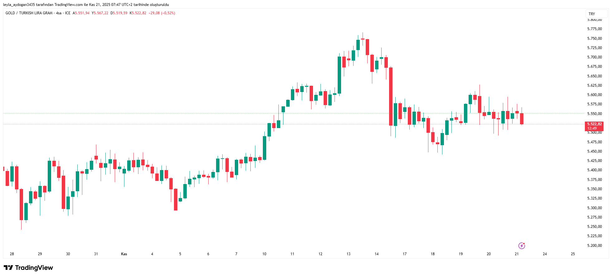 Gram altın haftanın son işlem gününün sabah saatlerinde 5 bin 522 liradan işlem görüyor. Kapalı Çarşı’da ise 5 bin 788 liradan satılırken alış fiyatı 5 bin 708 lira oldu. Alış-satış arasındaki fark 80 liraya yükseldi.