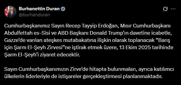 “Cumhurbaşkanımız Sayın Recep Tayyip Erdoğan, Mısır Cumhurbaşkanı Abdulfettah es-Sisi ve ABD Başkanı Donald Trump’ın davetine icabetle, Gazze’de varılan ateşkes mutabakatına ilişkin olarak toplanacak “Barış için Şarm El-Şeyh Zirvesi”ne iştirak etmek üzere, 13 Ekim 2025 tarihinde Şarm El-Şeyh’i ziyaret edecektir.