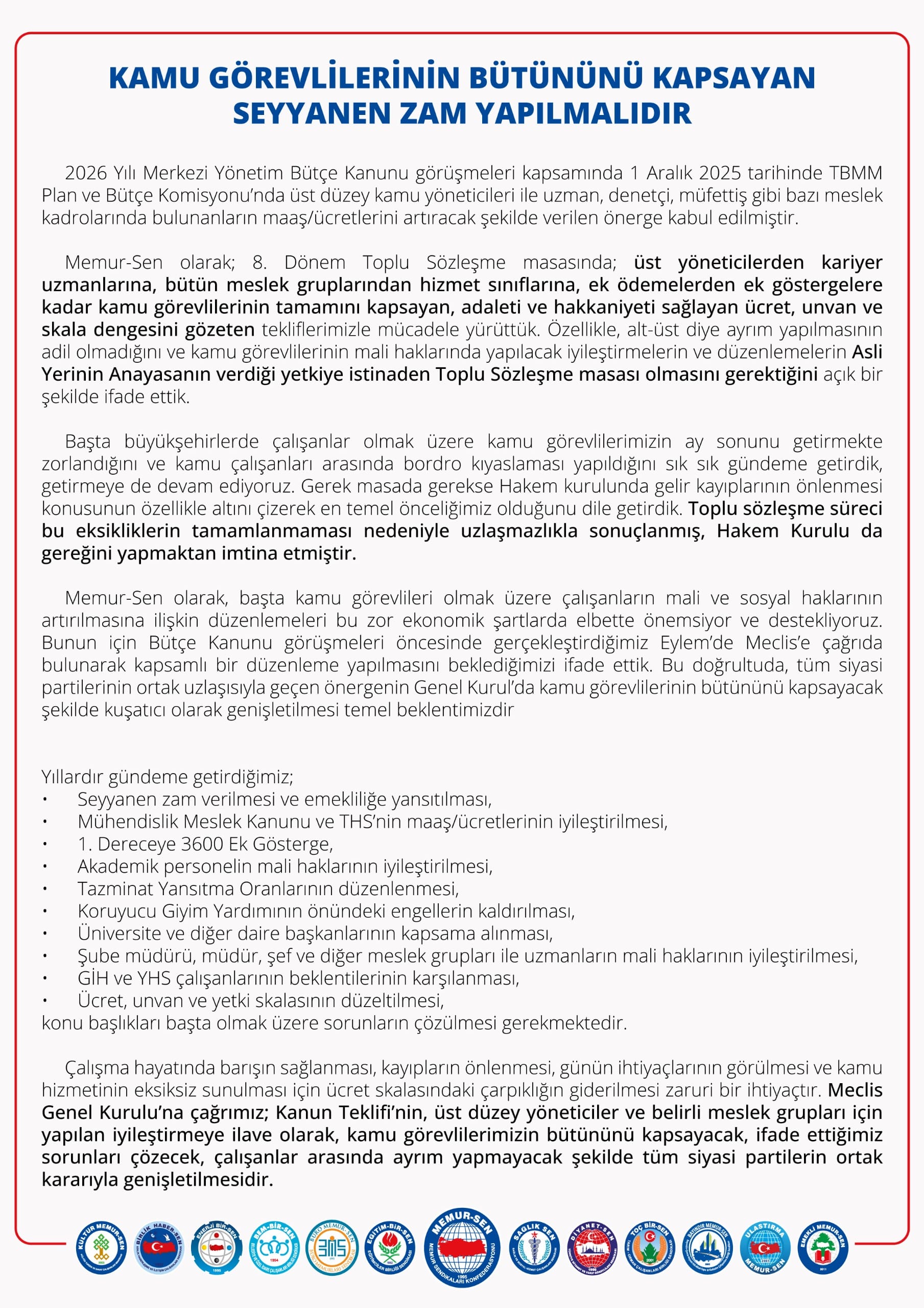 Memur-Sen: “Meclis Genel Kurulu’na çağrımız; Kanun Teklifi’nin, üst düzey yöneticiler ve belirli meslek grupları için yapılan iyileştirmeye ilave olarak, kamu görevlilerimizin bütününü kapsayacak, çalışanlar arasında ayrım yapmayacak şekilde tüm siyasi partilerin ortak kararıyla genişletilmesidir.”