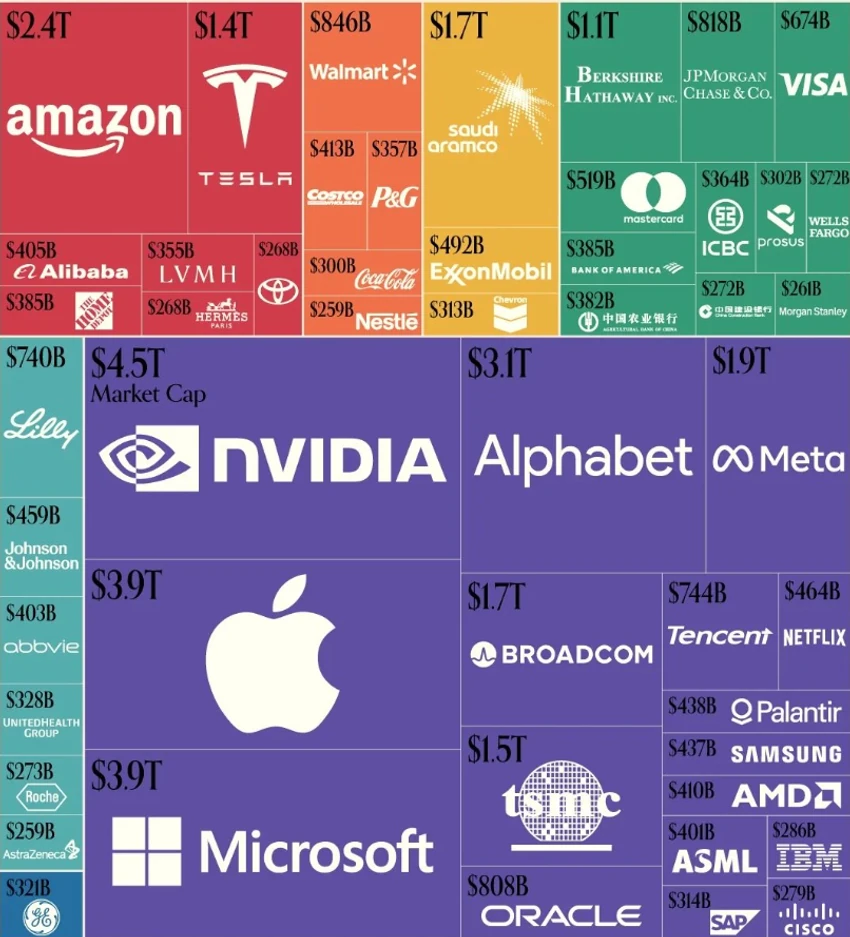 Bu görselleştirmenin verileri, halka açık şirketlerin piyasa değerini gerçek zamanlı olarak takip etmek için basit ve etkili bir araç olan CompaniesMarketCap’ten alınmıştır.